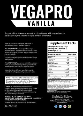 - Vegapro Vanilla is made up of three vegan proteins: Quinoa, Brown rice and Pea Isolate.